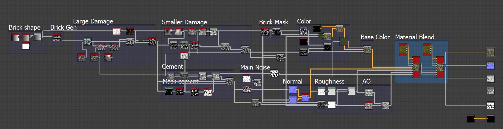 Other than this the basic shape has been made now it's just for the coloring which is again completely adjustable but with a few other bits thrown in to create height maps, ambient occlusion, normal, metallic, mask, roughness and the overall base color. I would explain the graph in more detail but it's minor details added in from here onward. Here is the overall graph for you to get a understanding of the layout and how I went about starting the graph all the way to the end.