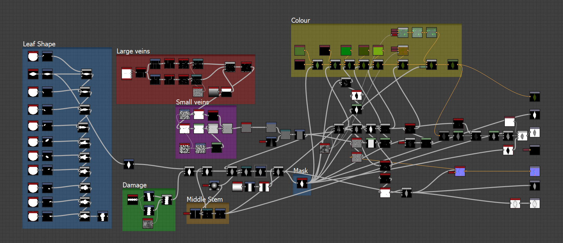 Next the damage node, it is at the beginning of the graph because it is the base of color, scaling of the leaf, form as well as age. It is blended with the shape with Min (Darken) so the damage is just a background damage I'm yet to work out if anything else would be better here but this was taken from a previous guide (https://www.youtube.com/watch?v=_UeCIak8sBk) which shows you how to add small edge wear to the leaf itself. Although his isn't exactly like this it still works with the same concept in mind. Whether or not it is better or worse in some opinions it works, this can be completely manipulated so if you don't think it looks good you can completely rearrange it to your own liking.