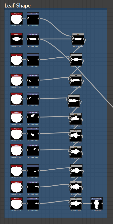 The curvature in the leaf is from a basic 2D transform with a shape put into the intensity of a directional warp. Normally people would use something like a cylinder or a circle to create this but I wanted it to be really intense and adjustable so what I done was added a cone with a tiling of 1 so that I can tile it in the 2D transform and make it completely adjustable.