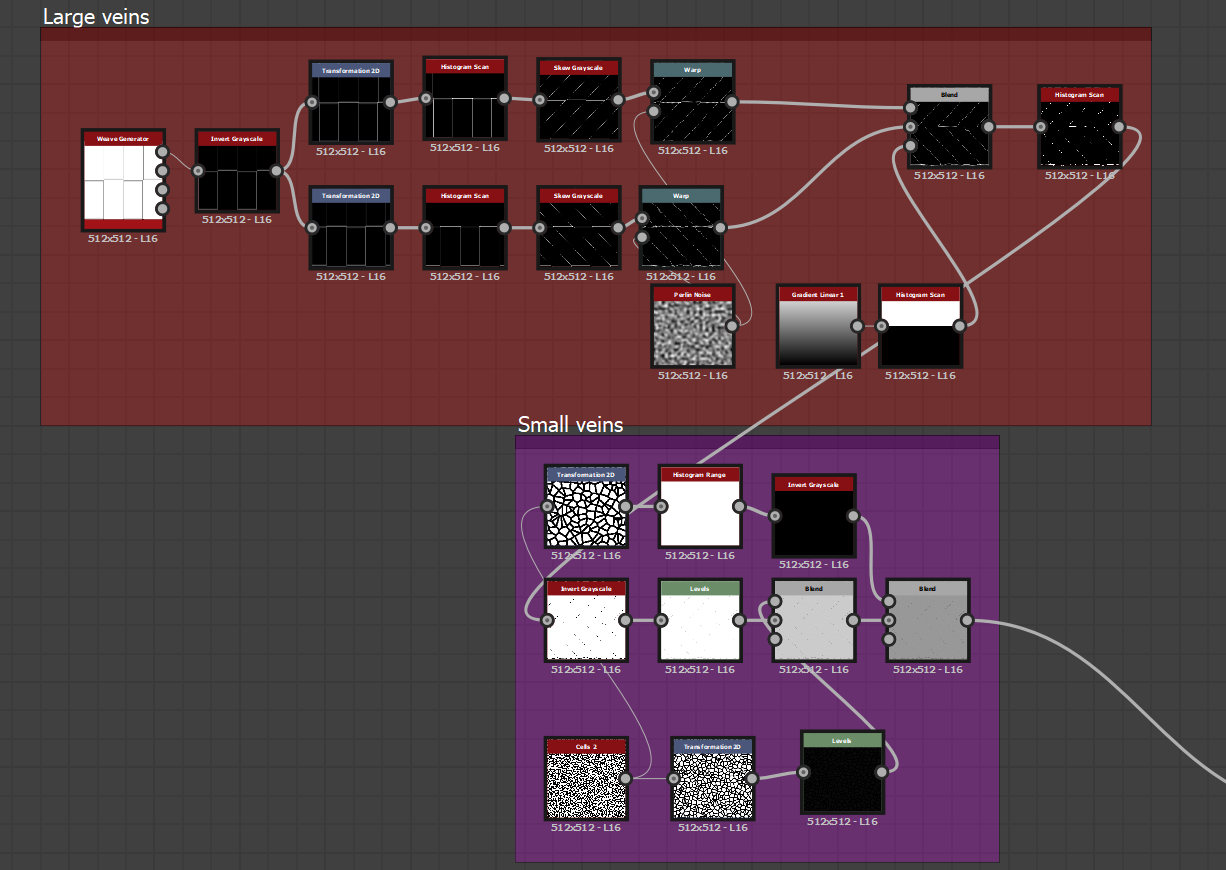 Second detail would be the veins, like I said before it is all completely adjustable and anyone with the graph has complete control over what they can make and with the layout of the grid hopefully it is simple and understanding. The veins themselves are easily manipulated and can be transformed, moved or even completely deleted if they want, intensity settings in the histogram scan as well as height mapping with the invert gray scale and histogram range.
