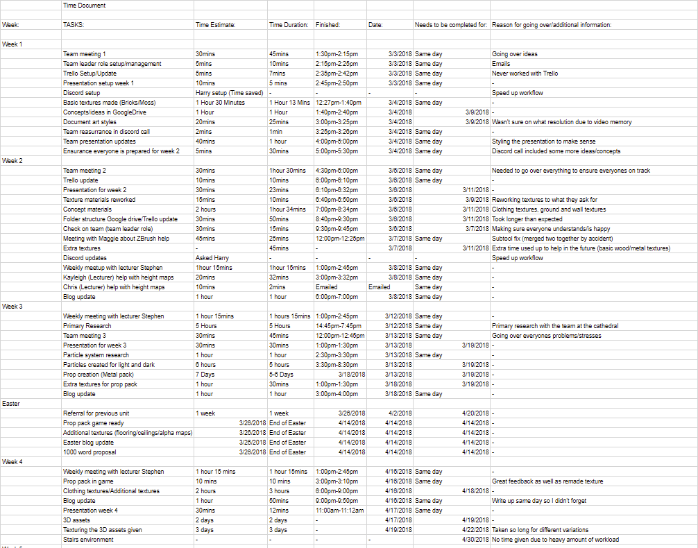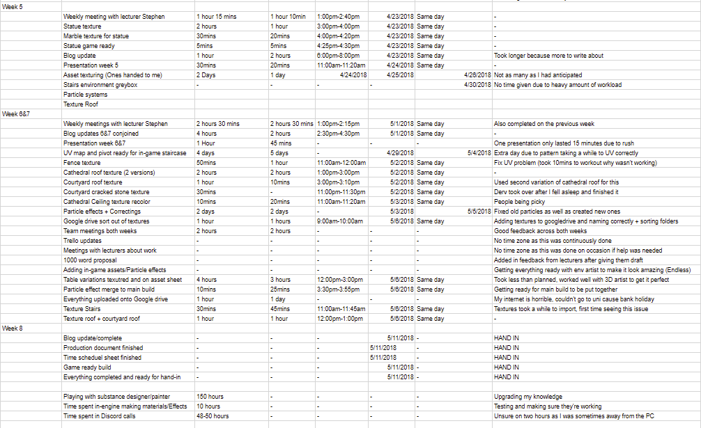 This basic time document include most of the hours I remembered to jot down, including all of my progression throughout the main textures/assets I done as well as meetings, uni time and time spent on getting everything ready is also included and then miscellaneous is kept to minimal amounts such as time spent in uni with lecturers and meetings/emails with lecturers. It kinda speaks for itself but as you can imagine it all worked out in the end in relation to keeping track of time. I am going to be honest as say not everything is here but I put down what I can remember working on the days and towards the end left a overall estimate of time on the programs I used during this term.