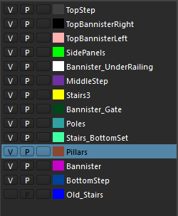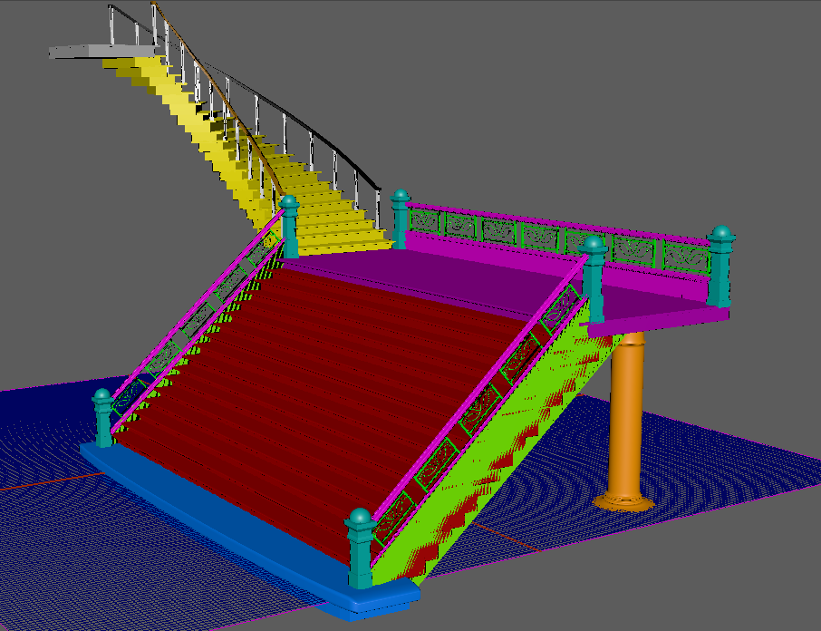 Starting off I'll show you the way I've decided to UV map my staircase because I'm using the color ID to let me texture it properly. All of the UVs are overlapped but because of the color ID I can set it so the texture will only go on certain colors. Shown below is a example of this.
