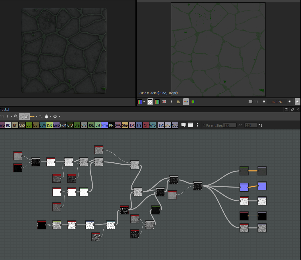 Although these tiles are basic they don't need to be adventurous like the other textures as these wont be looked at much and I want to try and take away attention from the roof due to the player having to concentrate on the game play at hand. Moving on from this as there's not much to talk about as it's just tile generation manipulation I was then asked to make a cracked floor with moss and dirt. This was something I've previously looked at but not had that big of a idea on how to create it. Here's my attempt shown below.