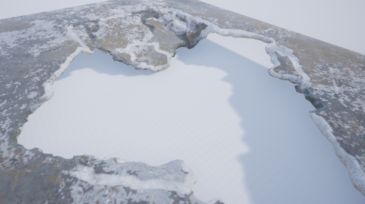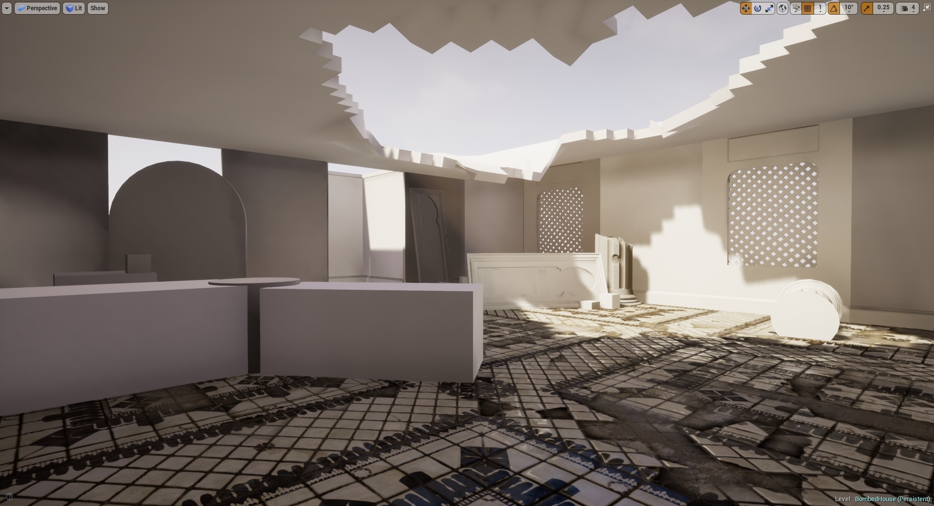 The same could be done for the floor section. What you've got there is cool, but you'll want to dress around that hole with lots of separate broken ceramic tile meshes, lumps of rubble and debris. Don't let people see that tiled floor material blending into the soft edges near the hole.