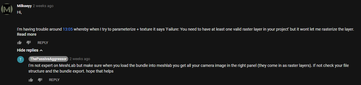 As I started to create my asset using Photogrammetry I had a few issues, primarily to do with my PC not being able to keep up with my unrealistic computations of wanting high end results whilst not using a render farm. Aside from my stupidity I asked a expert for help as the base tutorial I was following from YouTube helped me get an understanding of it and when I got stuck I kept referring back to it. The conversation is below, my photos wouldn't load into MeshLab but I realised after being told that I was using my Dense mesh which didn't contain any photos because this was data extracted from the photos instead of using the photo bundler file that I was meant to extract in the first place. Although the comments are from two weeks ago I learnt this as he replied and immediately fixed it.
