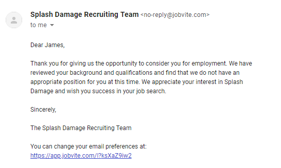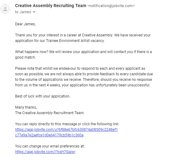 Splash Damage managed to get back to me after a minor period of time, it's upsetting to not get the role as I presumed they'd want a more experienced person but here they didn't mention much to do with art but more to do with the experience I needed. This entails that my experience overall needs to be increased in comparison to the actual level of art. I'm only presuming this by the wording but then again they may be just being polite. I'll reach out to some more of their environment artists to ask for any details referring to this.