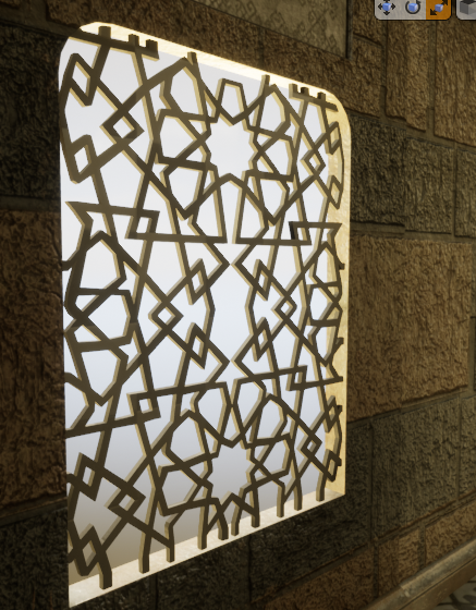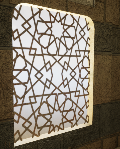 My second concept that was cut was creating an asset for a window, the idea behind the window was to create a Moroccan styled window which has cross hatches. The same window that I tried to get the light shafts to come through on, I decided to firstly make the asset using geometry. This idea was good but can be minimalism and made cheaper, after talking with Chris & Mark they mentioned that you can get exactly the same result just using a alpha card. After hearing about this and using my knowledge from my previous project I decided to go into substance designer and create the alpha and test this theory. This is what you can see in the scene instead of the geometry piece.