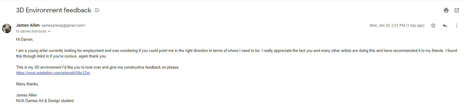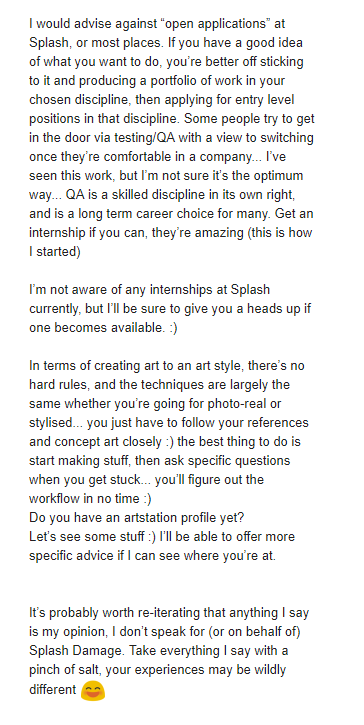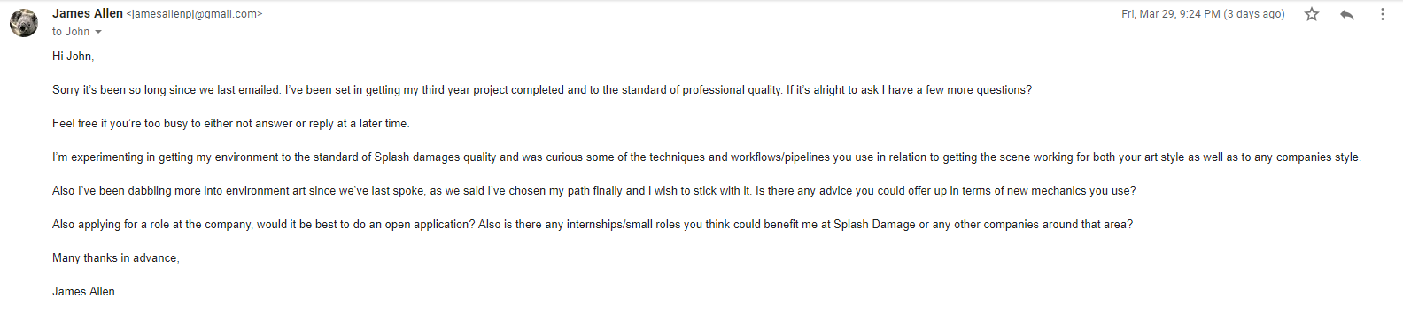 The environment artist John Barnard was someone who I had looked up to in terms of work on Art-station and many other traits as he has worked at Splash Damage previous and moved away and returned. The immediate thought was to message him and ask how he managed to get the job he wanted at such an amazing company. Although his thoughts here are distinct in terms of how he ended up here it shows his steps towards the goal. This allowed me to understand that maybe I wont start up at this company, I will have to do the same to in order to get the job of my dreams. He mentions within this email the good and bad points of the job and then the overall idea of how to go about getting the job that I want.