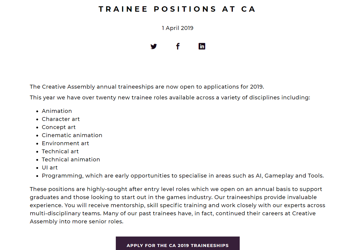 My next application after looking into more trainee roles would be to creative assembly as they provide the exact thing that the people at Digital Extremes had mentioned. I want to go for the environment art role as I've touched upon it but never properly taught how to go about doing this role entirely. I understand the basics of asset creation as well as most forms of environment art but there is always new and improved tricks to the trade and the industry is forever growing. You never know that the people teaching us could be teaching us outdated ways making this role perfect for me.